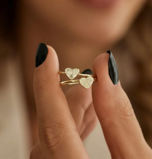 Minimal Fingerprint Heart Gold Ring. Featuring a beautifully textured heart motif on a sleek, delicate band, this ring is designed for effortless elegance and everyday charm. Perfect for:Valentine’s Day, anniversaries, birthdays, bridal gifts, or self-love treats. Features: Elegant heart-shaped centerpiece Premium 18k gold and silver finish Minimal and modern design...