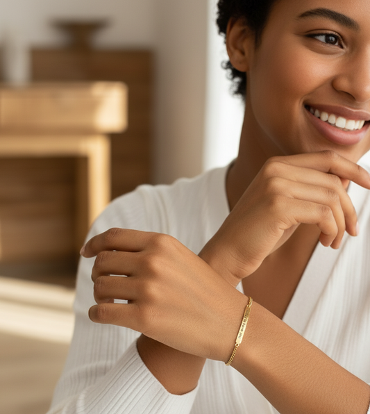 Personalised Name Chain Bracelet, designed to be worn every day. Featuring a sleek name bar engraved with your chosen word or name Why you’ll love it: Custom engraved name or word Clean, minimal bar design Lightweight & comfortable for all-day wear A subtle yet meaningful statement piece Product Details: Material:...