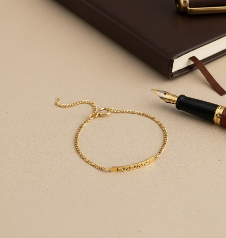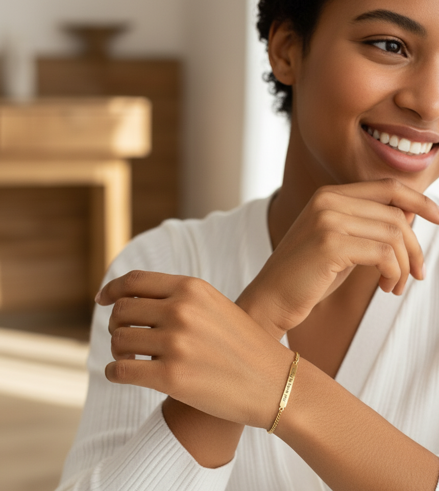 Personalised Name Chain Bracelet features a sleek engraved bar designed to hold a name, phrase, or meaningful message making it a timeless.